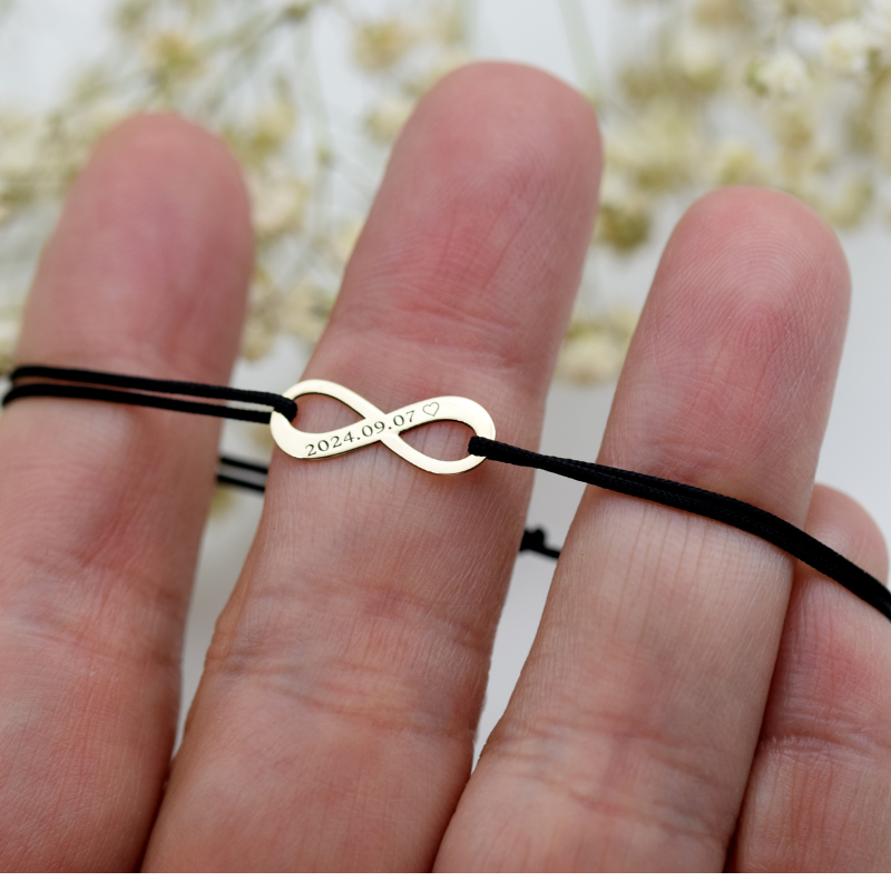 Brățară reglabilă cu simbol infinit din aur 14K, personalizabilă cu nume sau inițiale. Bijuterie elegantă și simbolică pentru iubire eternă.