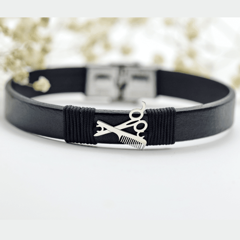 Brățară realizată manual pe șnur din piele naturală, accesorizată cu simbol hairstilyst din argint 925 și închizătoare din inox inoxidabil – o bijuterie, cu un design modern și masculin.