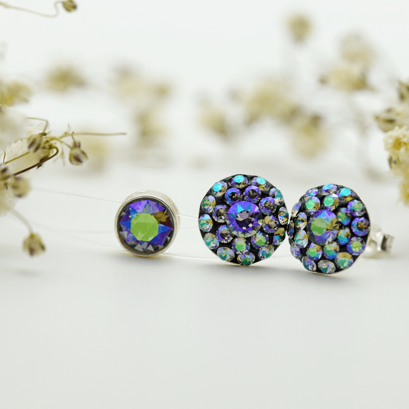 Cercei delicati, montați pe tortițe tip șurub (cuiuț) din argint 925, decorați manual cu cristale în nuanțele alese de tine.