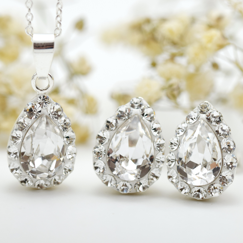 Set handmade din argint 925, format din cercei și lănțișor cu pandantiv în formă de picătură, decorat cu cristal strălucitor. Un accesoriu elegant și rafinat, perfect pentru orice ocazie.